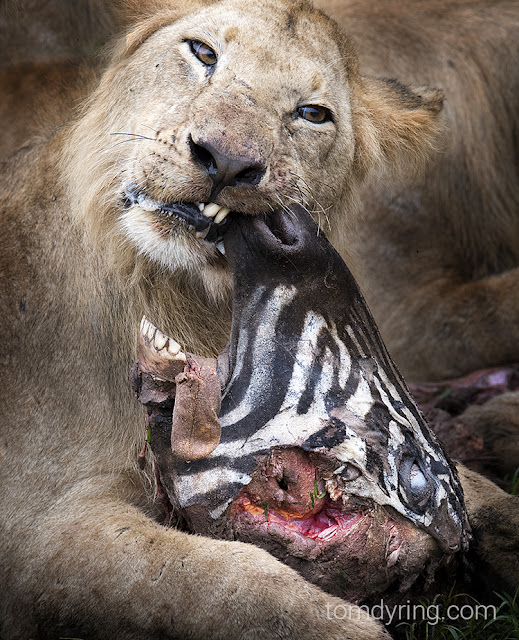 ... once again the unsentimental beauty (?) ... with the young male lion working on the carcass, buffalo skeleton with the glow of morning sun through the red ribs and the skinned skull ... almost smiling.